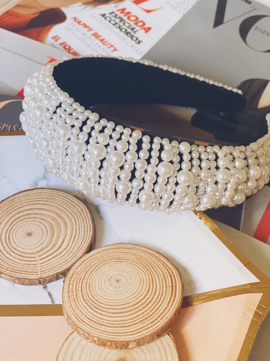 Diadema ancha forradita en terciopelo negro. Formada por perlas de diferentes tamaños.