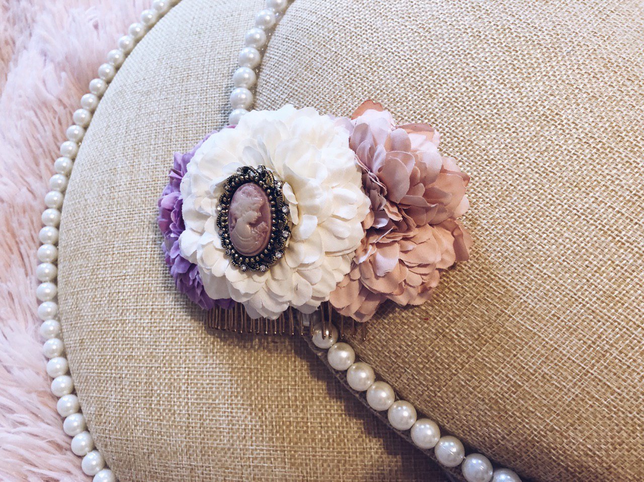 Peina de flores semisecas. Tonos nude, rosa y malva. Camafeo malva en el centro. Base peina dorada.